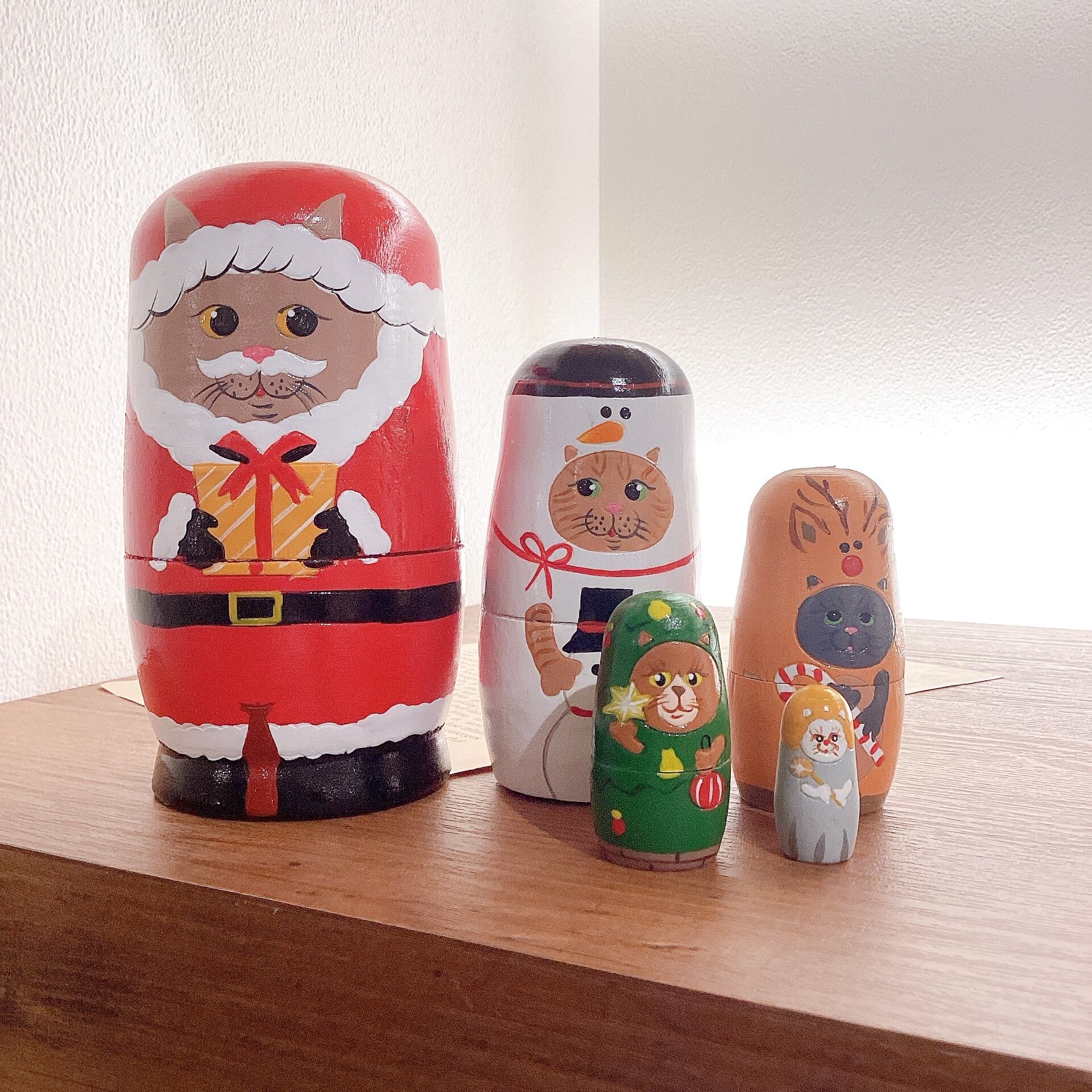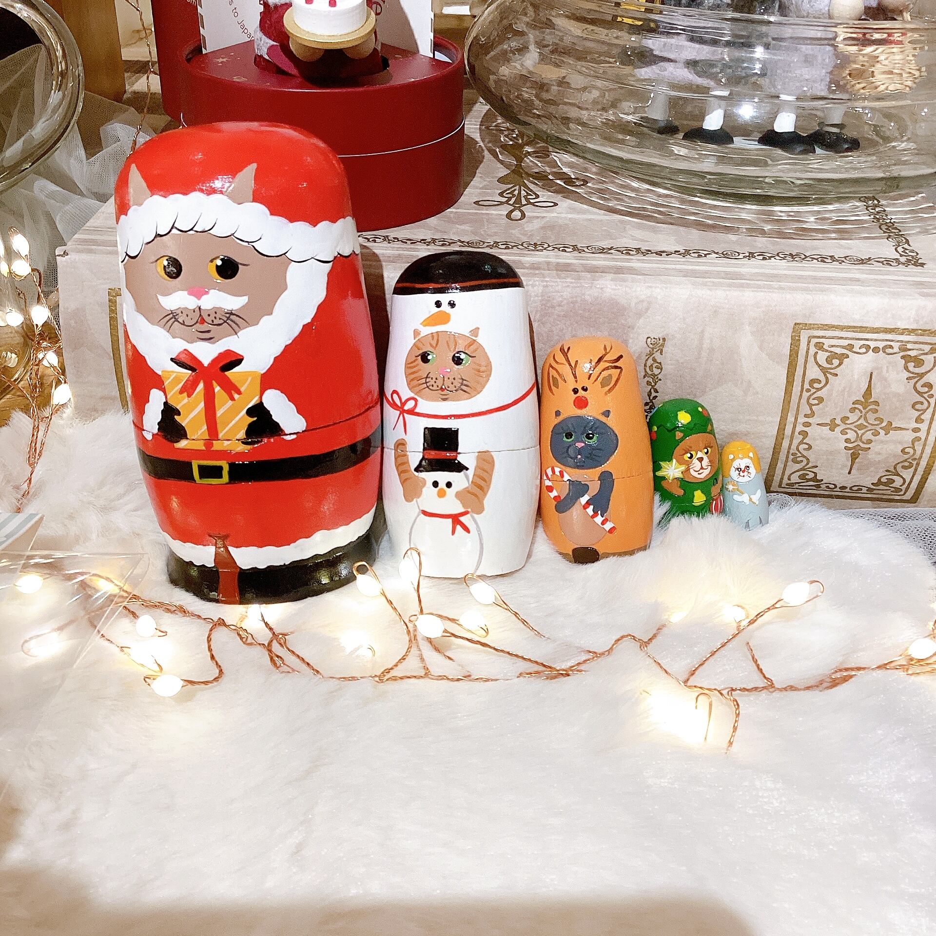 クリスマスを楽しむ猫たちの、木製マトリョーシカ。サンタや雪だるま、トナカイ、ツリー、天使に扮した猫たちのイラストが次々と現れる、手のひらサイズの木製マトリョーシカです。少しラフなタッチで描かれた表情や姿には、可愛らしさと愛嬌が感じられます。ひとつひとつのディテールが少しずつ異なるのも、手描きならではの味わいです。玄関やリビングにさりげなく飾るだけで、クリスマスの温かい雰囲気をプラス。箱入りなので、猫好きの方へのギフトとしてもおすすめです。