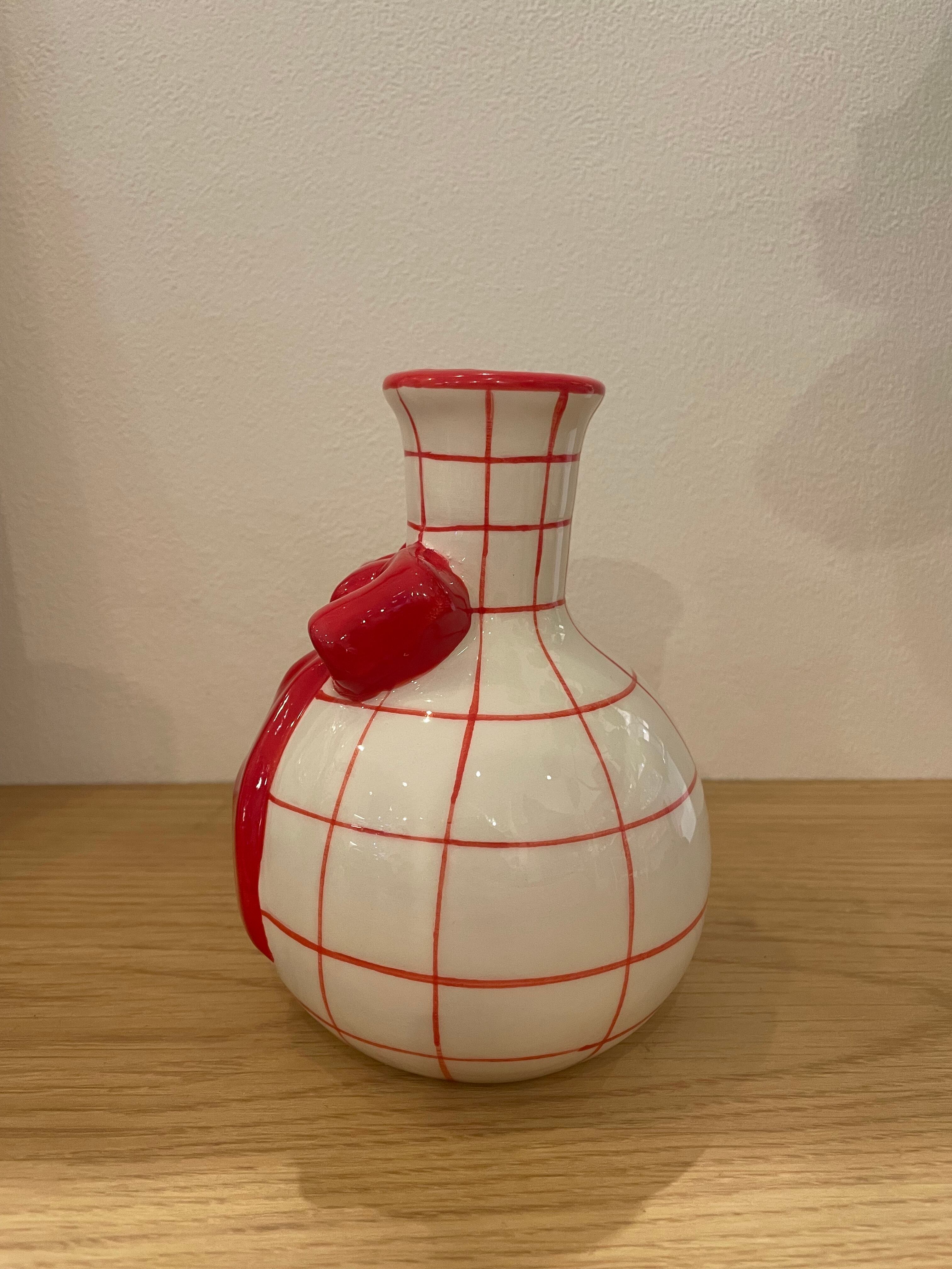 ぷっくりと赤い大きなリボンに格子柄のデザインがチャーミングなフラワーベースです。 玄関先やサイドテーブルに置くのにちょうどいい大きさで、お花を美しく見せてくれます。