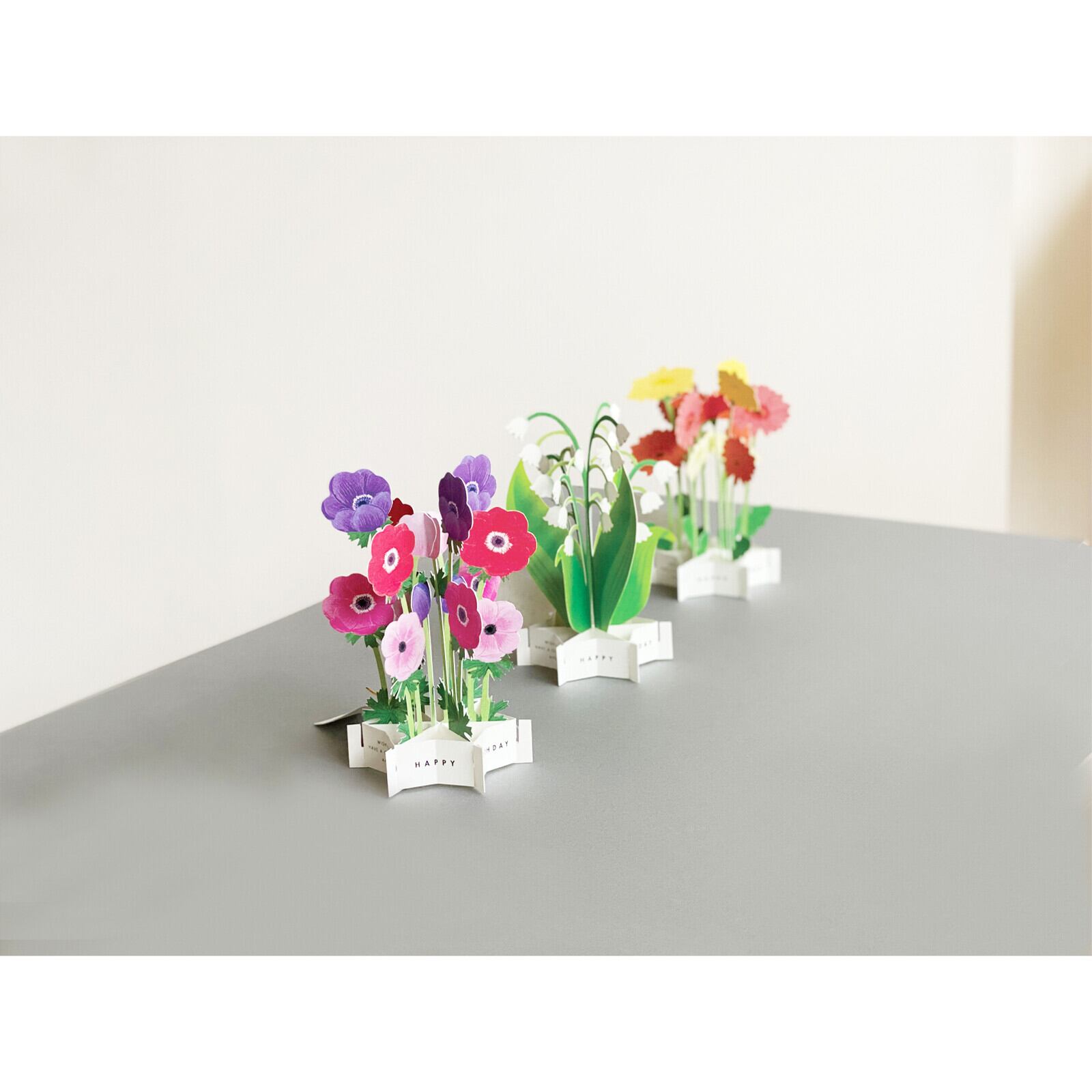 花がそこに咲いているようなポップアップカードですくるっと360°開いてゴムでとめることで、立てて飾ることができます。タグの裏面にメッセージ欄があります。