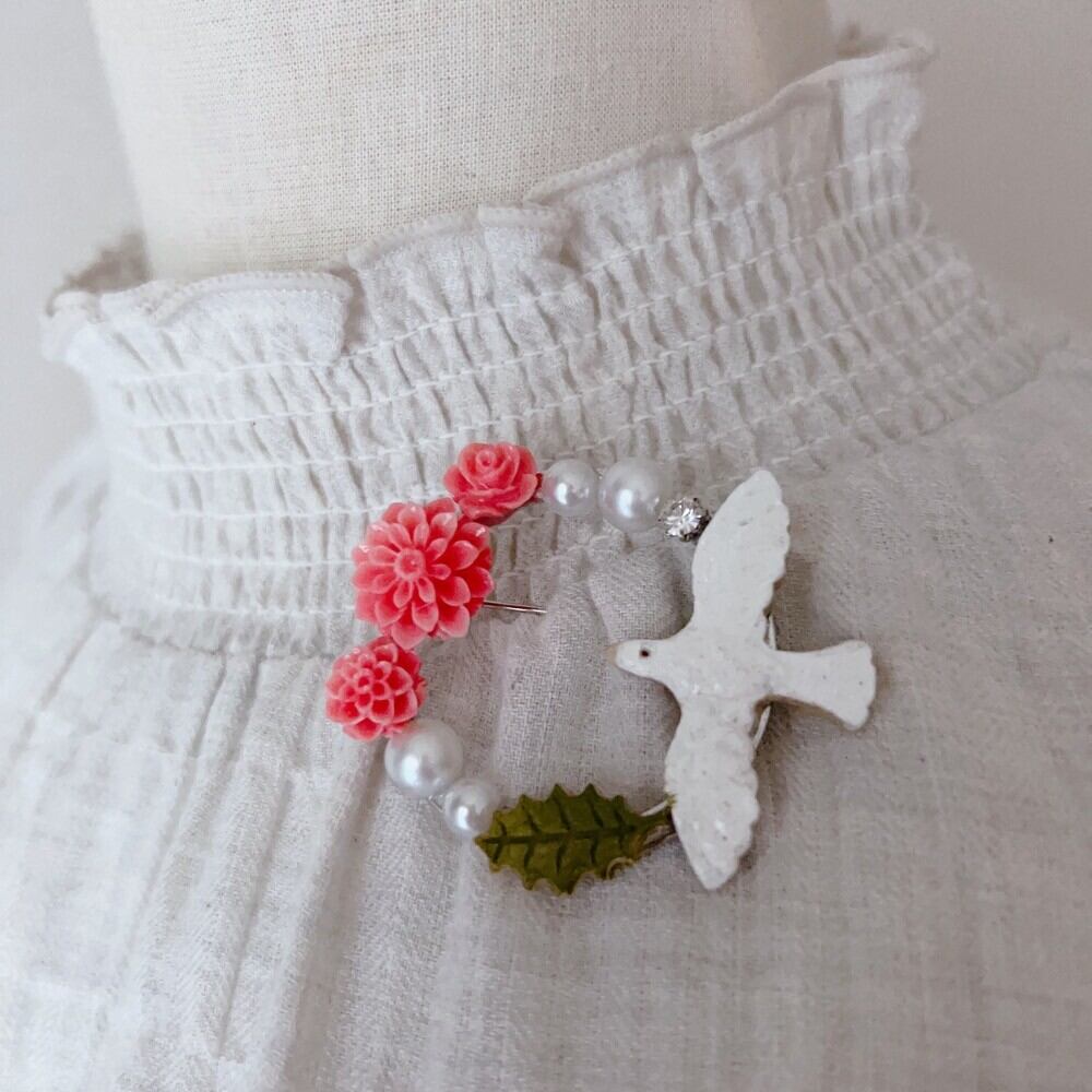 オーブン陶土で作った、小鳥とお花のブローチ(シャコ貝)です